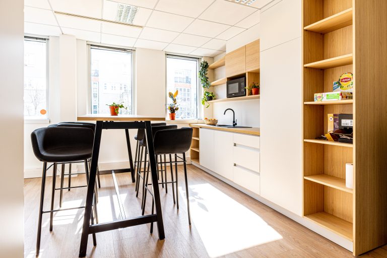 Il a été très agréable de travailler pour Risk & Co qui, après avoir établi leur cahier des charges, nous a laissé assez libre de proposer de nouveaux espaces au sein des plateaux. À l’instar de l’espace tisanerie qui ne remplit plus seulement des usages strictement fonctionnels (café, thé, déjeuner) mais qui propose également des espaces permettant de s’installer pour échanger, travailler, collaborer. Un espace qui répond ainsi, selon les moments de la journée, aux nouveaux besoins des collaborateurs.